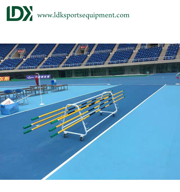 Factory custom outdoor standard high jump pole bar laying frame, custom outdoor high jump pole bar laying frame made of steel, the surface after treatment, not easy to oxidize and use a long time, in order to facilitate the movement, we designed the outdoor high Jump pole beam built-in four wheels, can be free to move,