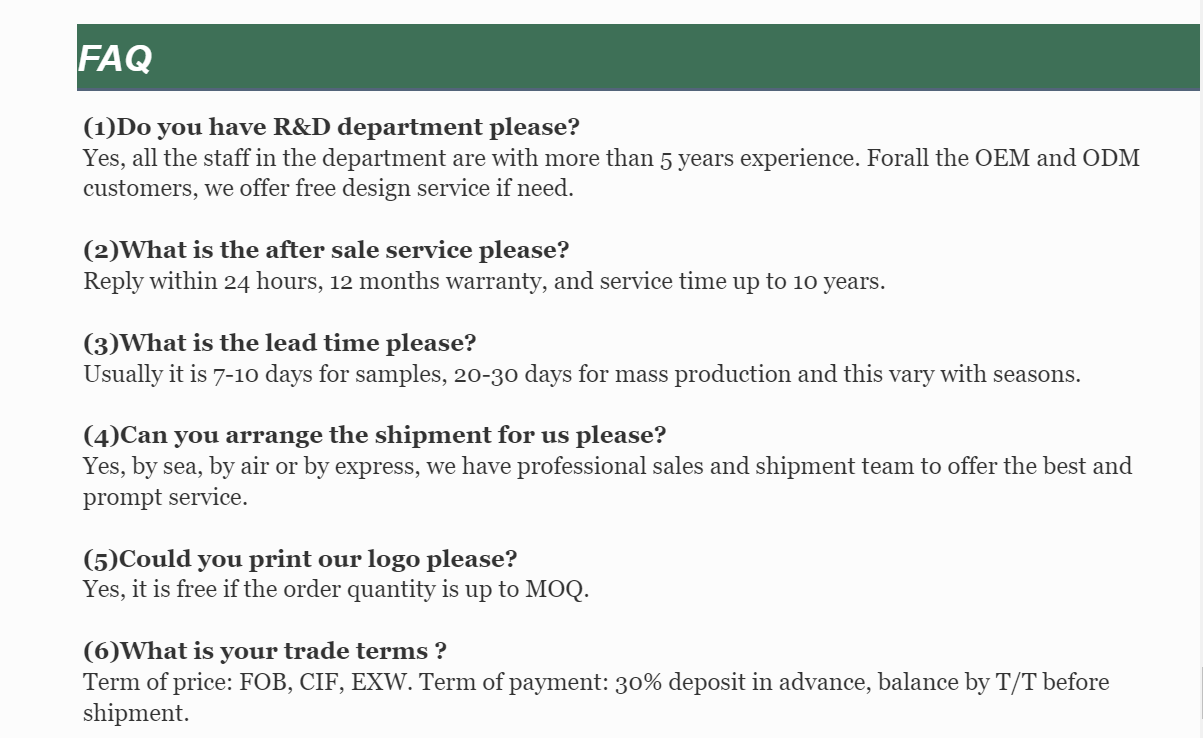 Reply within 24 hours, 12 months warranty, and service time up to 10 years.