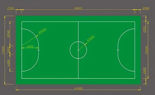 Draw a circle with the center of the court as the midpoint (kick-off point) and a radius of 6 meters.9. Corner area